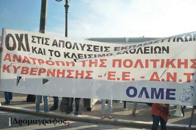 και πανό ενάντια στην πολιτική της κυβέρνησης και της τρόικα, ενάντια στις απολύσεις και την διαθεσιμότητα χιλιάδων εργαζομένων, ενάντια στην αξιολόγηση που θα λειτουργήσει ως νέος μηχανισμός απολύσεων, υπέρ της κάλυψης των βασικών αναγκών του λαού σε ρεύμα, νερό, υγεία και παιδεία.