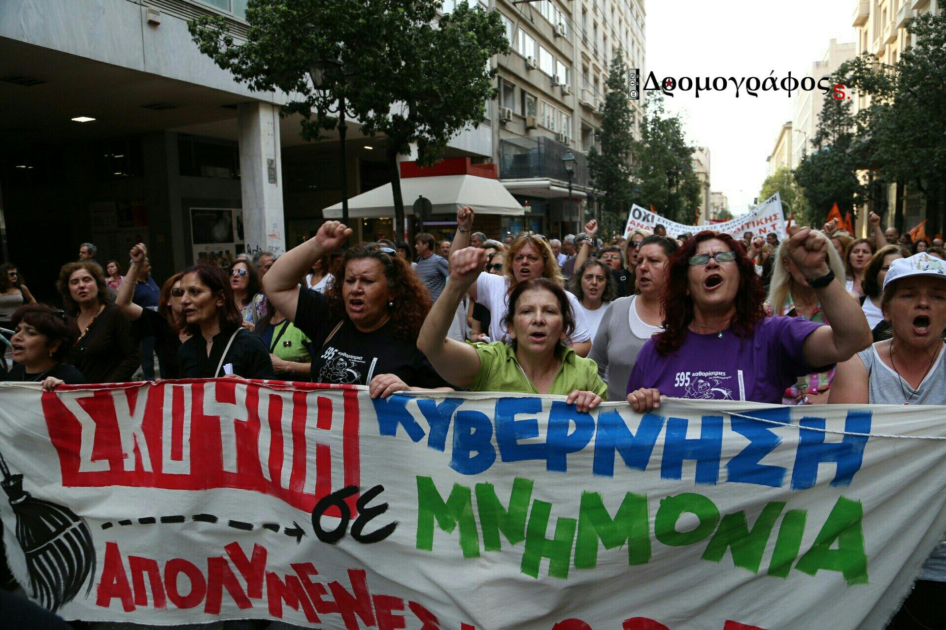 Συγκέντρωση διαμαρτυρίας ενάντια στις διαθεσιμότητες και απολύσεις πραγματοποιήθηκε χθες Πέμπτη 5/6 το απόγευμα στην πλατεία Κλαυθμώνος, με πορεία στο ΥΠΟΙΚ όπου συνεχίζεται η καθιστική διαμαρτυρία των καθαριστριών (28η μέρα) των σχολικών φυλάκων (5η μέρα) και των εκπαιδευτικών (2η μέρα)