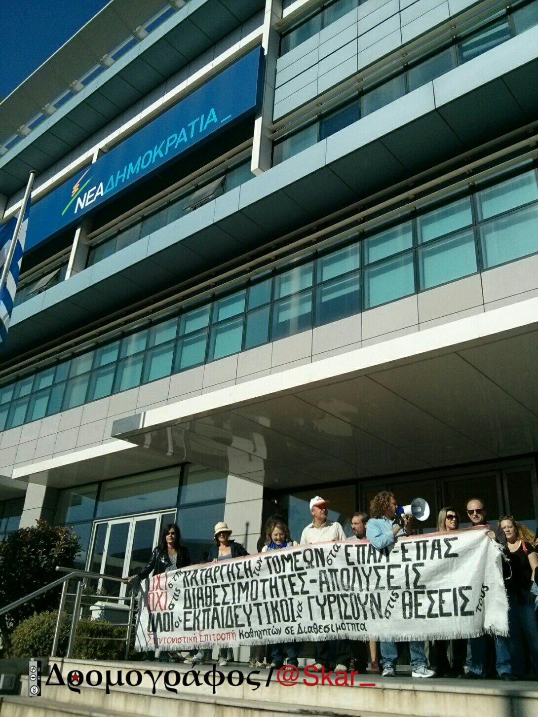 Σήμερα Δευτέρα 20/10 το πρωί, δεκάδες εκπαιδευτικοί σε διαθεσιμότητα πραγματοποιήσαμε αγωνιστική παράσταση διαμαρτυρίας στα γραφεία της Νέας Δημοκρατίας ( στη Λ. Συγγρού), με σκοπό: